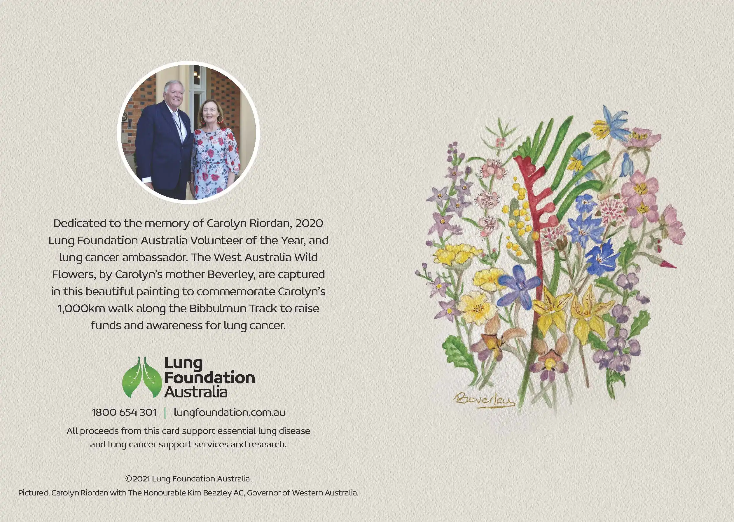 These cards are in memory of lung cancer ambassador and our 2020 Volunteer of the Year, Carolyn Riordan, who passed away in 2020. The West Australia Wildflowers design is by Carolyn’s mother Beverley, are captured in the beautiful artwork to commemorate Carolyn’s 1,000km walk along the Bibbulmun Track to raise funds and awareness of lung cancer.