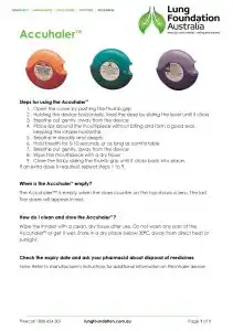 The Accuhaler Inhaler Device Technique Factsheet from Lung Foundation Australia provides essential guidance to help people with COPD or asthma use their Accuhaler correctly. The Accuhaler is a breath-activated dry powder inhaler designed to deliver medication directly to the lungs, but proper technique is essential to ensure the full dose is received. Many people do not realise they are using their inhaler incorrectly, which can lead to reduced symptom control, increased breathlessness, and a higher risk of exacerbations. This factsheet offers step-by-step instructions to help users improve their inhaler technique and get the most from their treatment.
