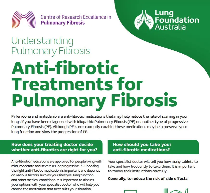 The Anti-fibrotic Treatments for Pulmonary Fibrosis (PF) fact sheet by Lung Foundation Australia offers essential guidance on managing PF with medications like pirfenidone and nintedanib. These anti-fibrotic drugs are prescribed for individuals diagnosed with Idiopathic Pulmonary Fibrosis (IPF) or other forms of progressive PF, aiming to slow lung scarring and preserve lung function. It is important to discuss your options with your specialist doctor who will help you choose the medication that best suits your situation.