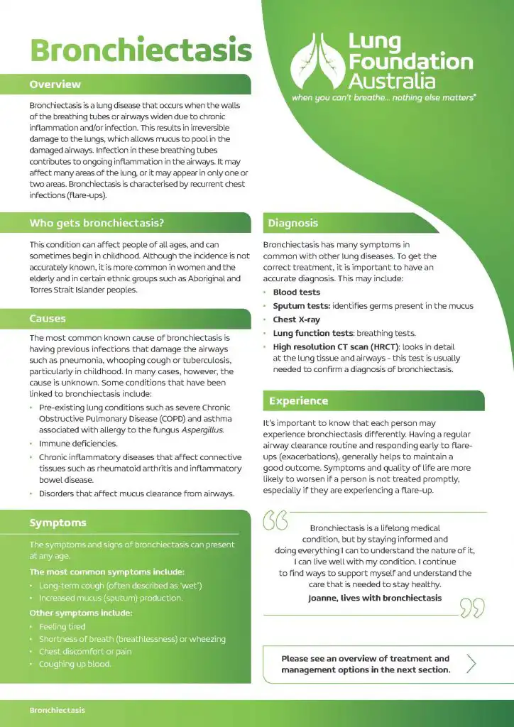 For further detailed information you can access Lung Foundation Australia’s webpage on Bronchiectasis.
