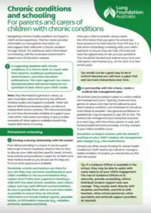 This fact sheet from Lung Foundation Australia is a valuable resource for parents and carers of children with chronic respiratory conditions, such as childhood interstitial lung disease. It offers essential guidance on navigating the school system to ensure their child’s educational needs are met. It outlines practical steps to establish strong relationships with schools, emphasising the importance of early communication with teachers and administrators to ensure they understand the child’s medical requirements, including considerations for medications, therapies and assessments. The resource provides insights on creating a medical risk management plan in partnership with the school, including details on accommodations, funding options, and available support services.
