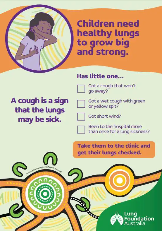 This factsheet empowers Aboriginal and Torres Strait Islander families with life-saving knowledge about lung health and the steps they can take to prevent a chronic wet cough becoming a long-term (chronic) issue. By recognising the warning signs of chronic wet cough and taking early action, parents and caregivers can ensure children get the care they need to breathe easy and thrive. If a child’s cough lasts for more than four weeks, visit a health clinic or your local health service for assessment and treatment by a health professional.