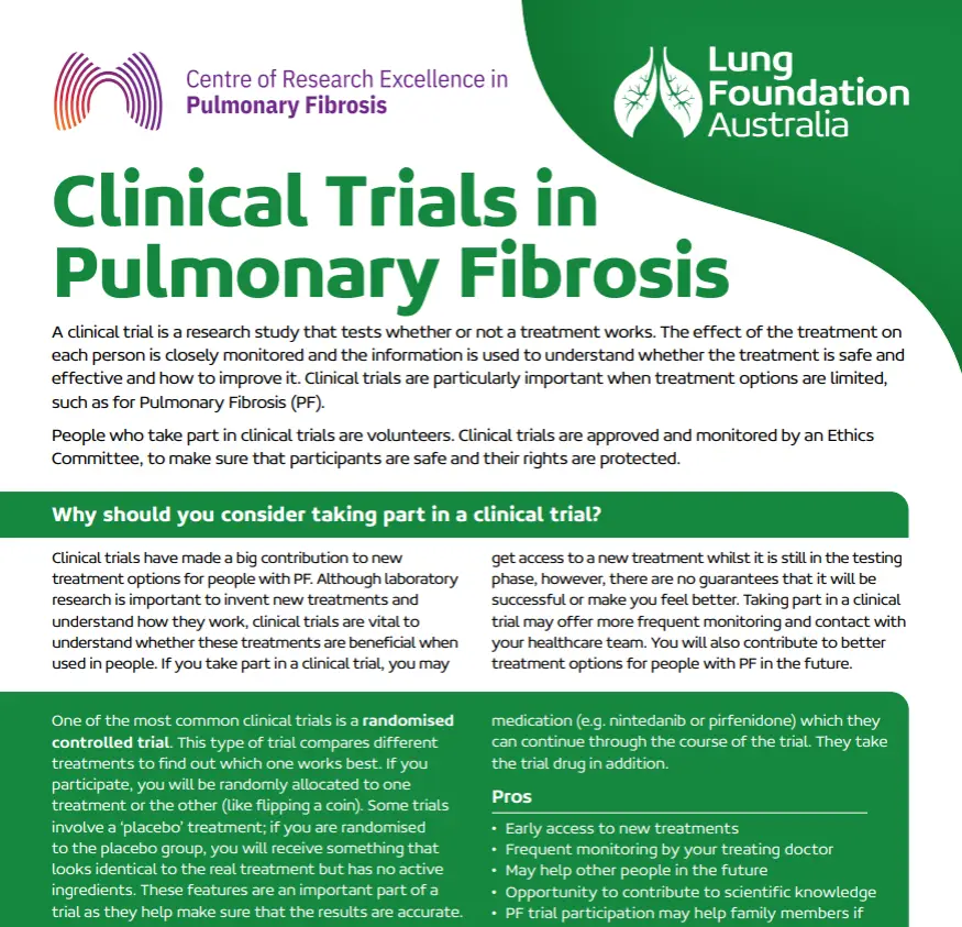 The clinical trials in pulmonary fibrosis (PF) fact sheet provides a brief overview of clinical trials and their place in current treatment and management. Participating in clinical trials offers several benefits, including access to new treatments during their testing phase, frequent monitoring and contact with healthcare teams, and the opportunity to contribute to future treatment options for pulmonary fibrosis (PF).