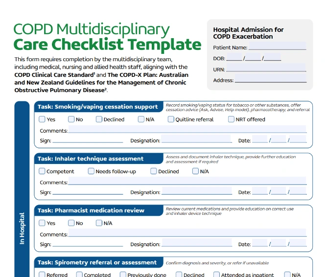 Developed for use by medical, nursing, pharmacy, physiotherapy and allied health clinicians, the checklist ensures that every essential component of acute COPD management is completed and recorded. It guides teams step-by-step through critical tasks such as smoking cessation support, inhaler device technique assessment and teaching, medication review, oxygen therapy, spirometry referral, vaccination discussions, pulmonary rehabilitation referral and discharge planning. This structured approach reduces variation in care, supports clinical decision-making and strengthens communication across disciplines.