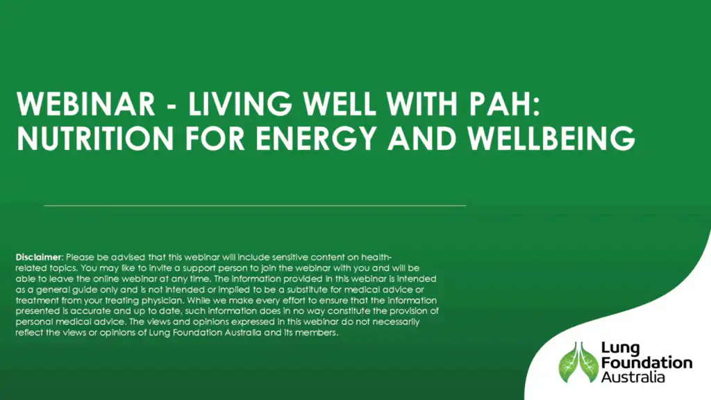 In this webinar, Dr Aziz Rahman (Professor of Public Health, Federation University Australia) and Ms Alison Wright (Qualified Nutritionist and Wellbeing Programs Specialist) explore how nutrition and dietary strategies can support people living with Pulmonary Arterial Hypertension (PAH). The session provides an evidence-based understanding of how food, electrolytes and lifestyle choices can help manage symptoms, support energy levels, and promote overall wellbeing.