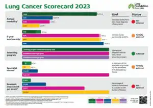 Our ‘Lung Cancer Scorecard 2023’ that highlights progress and compares outcomes between Australia’s most common cancers. Whilst we can celebrate significant progress in lung cancer following the announcement of a lung cancer screening program in the 2023 federal budget and government investment in specialist lung cancer nurses, research and support for lung cancer remains devastatingly low. Current funding for lung cancer does not match its burden and is not equitable. There is more to be done and Lung Foundation Australia will continue to shine a light on lung cancer.