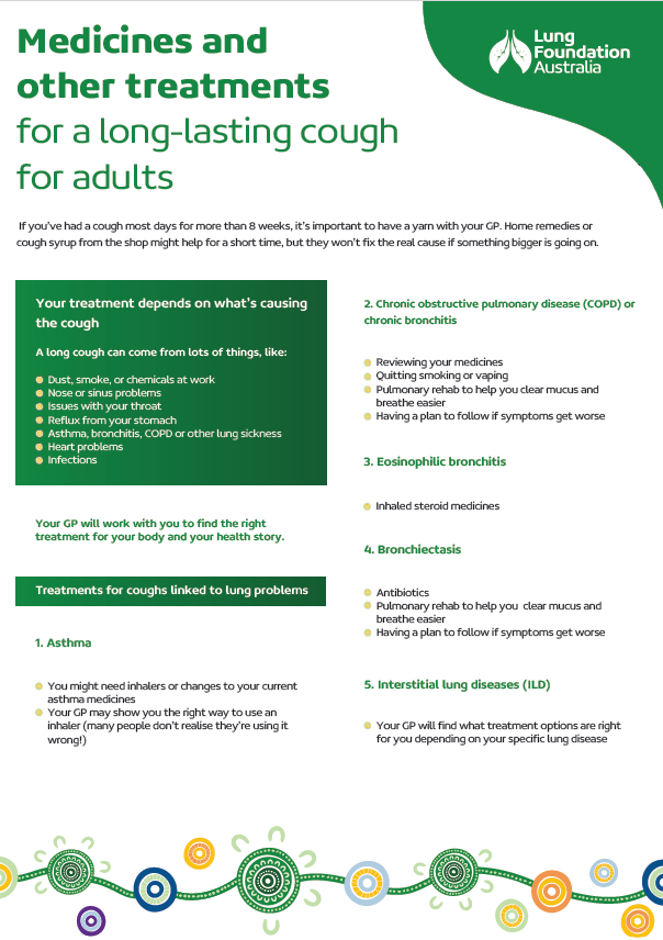 This factsheet from Lung Foundation Australia explains why a cough might not go away and why it’s important to get your cough checked. It’s important to make sure you get the right treatment for you because not all coughs are the same.