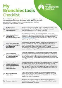 This factsheet from Lung Foundation Australia is a valuable resource designed to help you take control of your lung health if you’re living with bronchiectasis. Its main purpose is to provide you with a comprehensive bronchiectasis checklist that guides you in monitoring your condition, preparing for medical appointments, and making informed decisions about your treatment. By following this checklist, you can work more effectively with your healthcare team and stay on top of your symptoms.