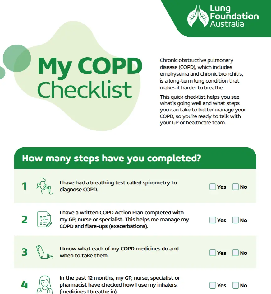 This resource, “My COPD Checklist,” is designed by the Lung Foundation Australia to empower people living with Chronic Obstructive Pulmonary Disease (COPD) by giving them a straightforward tool to monitor and manage their condition. Its main purpose is to help you track your symptoms, treatment progress, and overall lung health in a way that’s both easy to understand and practical to use every day.