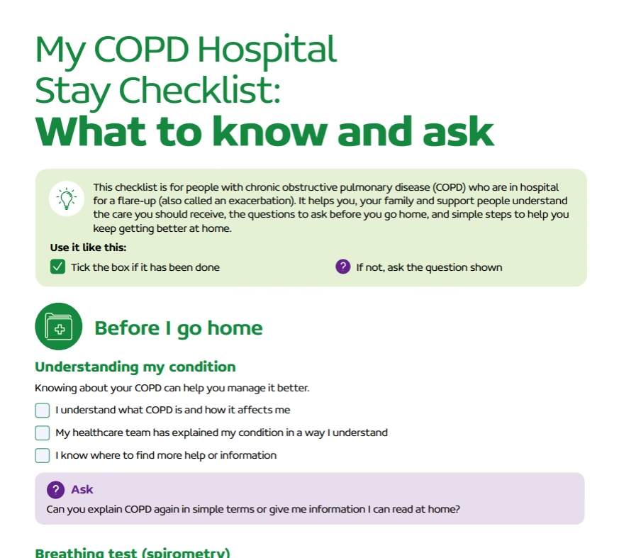 The My COPD Hospital Stay Checklist is designed to help you understand your care while you’re in hospital for a COPD flare-up and to feel confident about what to do once you go home. When your breathing suddenly worsens, a hospital stay can be stressful and confusing. This checklist gives you, your family and your support people a simple way to track what care you should receive, what information you need, and which questions to ask before discharge.