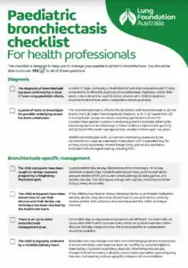 The “Paediatric Bronchiectasis Checklist” from Lung Foundation Australia is a valuable resource designed to assist healthcare professionals in managing bronchiectasis in children. This checklist aims to provide a structured approach to diagnosis, treatment, and ongoing care, ensuring better health outcomes for young patients.