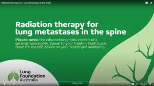 The video “Radiation Therapy for Lung Metastases in the Spine” by Lung Foundation Australia features A/Prof Michael Jones, a Radiation Oncologist, who discusses the use of radiation therapy for treating lung cancer that has spread to the spine. This therapy uses high-energy rays to target and kill cancer cells, aiming to control the growth and alleviate symptoms.