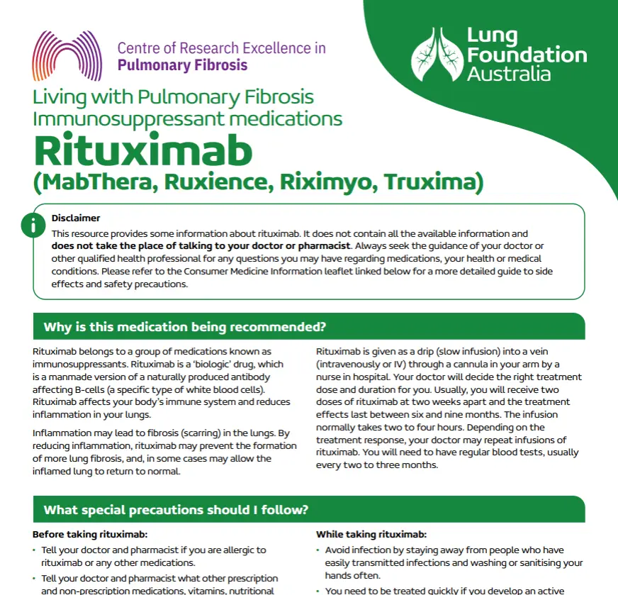 This fact sheet has been designed by Lung Foundation Australia to help people living with pulmonary fibrosis to understand more about the immunosuppressant medication, Rituximab (MabThera, Ruxience, Riximyo, Truxima).