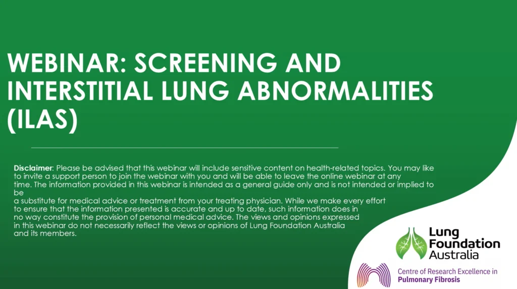 Lung Foundation Australia, in collaboration with the Centre of Research Excellence in Pulmonary Fibrosis, hosted the Screening and Interstitial Lung Abnormalities (ILAs) webinar, presented by Dr John Mackintosh, Respiratory and Lung Transplant Physician at the Prince Charles Hospital, Brisbane.
