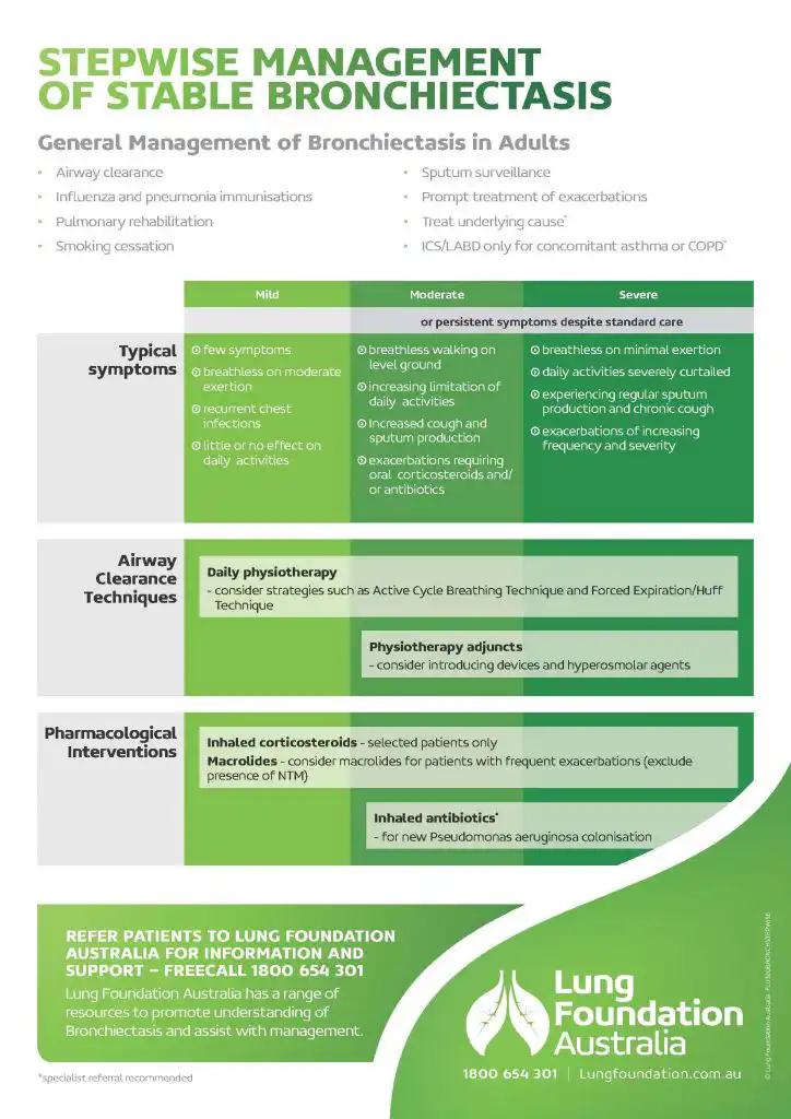 The “”Stepwise Management of Stable Bronchiectasis”” from Lung Foundation Australia is a detailed guide aimed at helping individuals manage bronchiectasis effectively. This resource provides clear, actionable steps for both healthcare professionals and patients, ensuring better health outcomes and improved quality of life.