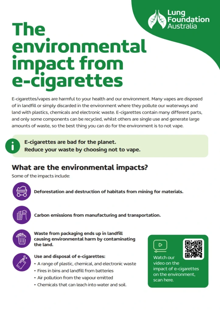 E-cigarettes are harmful to our environment and despite our best intentions e-cigarettes are difficult to dispose of in a safe manner. All waste damages our environment and the only way to ensure we are playing our role in protecting the environment is to reduce our waste altogether by choosing not to vape. Contact Quitline – 13 QUIT (13 7848) for advice, tips and strategies to quit vaping or visit quit.org.au For information about looking after your lungs visit Lung Foundation’s website www.lungfoundation.com.au