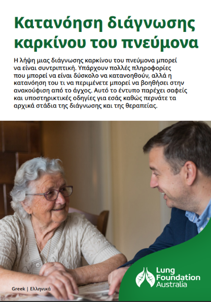 The understanding a lung cancer diagnosis booklet is available in Greek. This version provides essential information and support for Greek-speaking individuals and their families, making it easier for them to access trusted resources on lung cancer, treatment options, and care. By offering the booklet in Greek, the aim is to help more people in the community make informed decisions about their health.