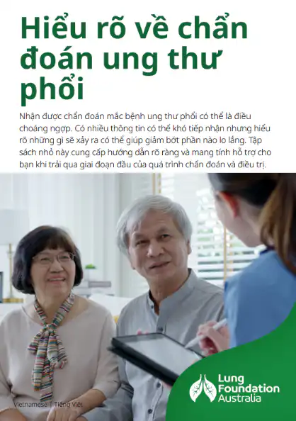 The understanding a lung cancer diagnosis booklet is available in Vietnamese. This version provides essential information and support for Vietnamese-speaking individuals and their families, making it easier for them to access trusted resources on lung cancer, treatment options, and care. By offering the booklet in Vietnamese, the aim is to help more people in the community make informed decisions about their health.