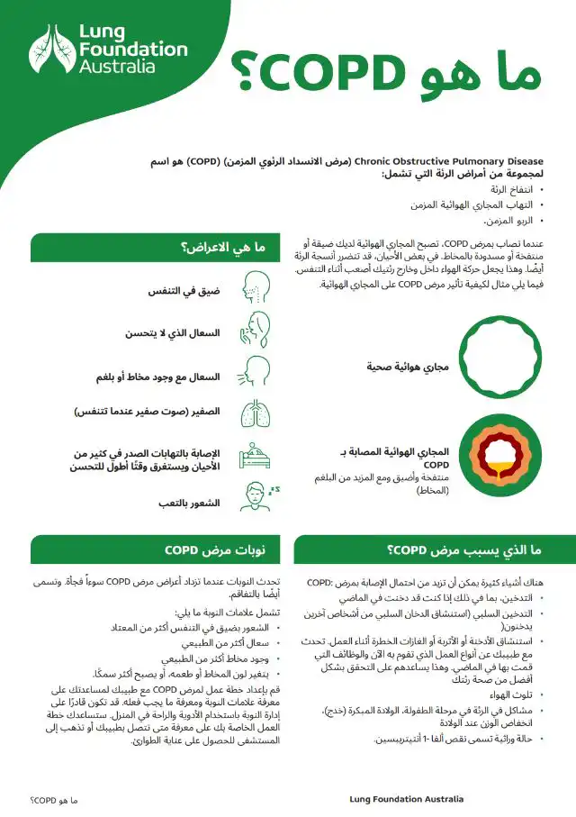 This fact sheet from Lung Foundation Australia provides essential information on Chronic Obstructive Pulmonary Disease (COPD), helping Arabic-speaking Australians understand the condition, its symptoms, and how to manage it effectively. COPD is a long-term lung disease that causes difficulty breathing due to narrowed airways and lung damage. The resource outlines key causes of COPD, including smoking, exposure to air pollution, and genetic factors, as well as symptoms like breathlessness, persistent cough, and increased mucus production.