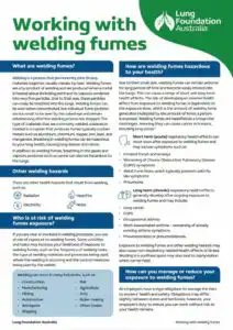 Welding is a process that permanently joins materials, usually metals, by heat. Welding fumes are a by-product of welding, produced when a metal is heated above its boiling point and its vapours condense into fine particles. This fact sheet is for anyone at-risk of welding fumes and aims to educate on the risks associated with welding fumes exposure; control measures that can help protect against exposure and current regulations in Australia.